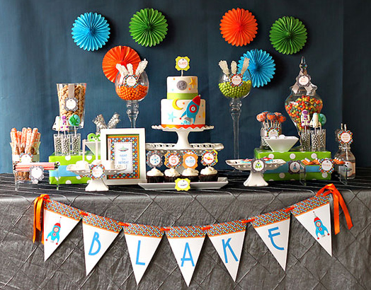 Today’s party is truly out of this world! We see so many adorable parties for little girls and babies… but great parties for little boys seem harder to come by. That makes today’s post even more fun! With a modern color scheme, oodles of creative details and a beautiful table of solar snacks, this party is perfect for little astronauts. Jasmine Clouser of The Couture Cakery let her imagination soar when she created this party for her son’s 5th birthday. Get ready to blast off for some fun and adventure with this incredible Outer Space Birthday Party!