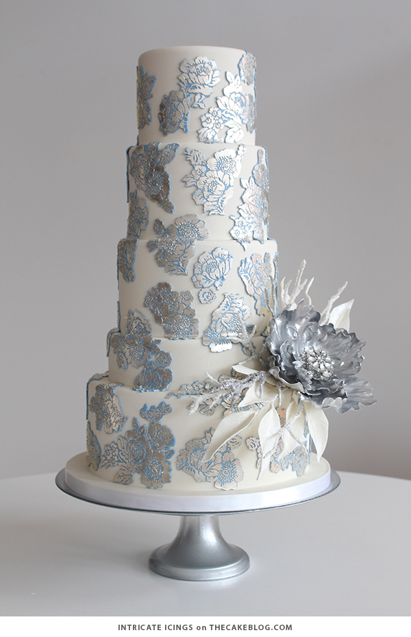 Inspired by a glacier blue gown, this design by Rachael Teufel of Intricate Icings Cake Design is perfectly frosty. Embossed modeling chocolate appliqués are accented with edible silver leaf while a single sugar flower shimmers with silver. (Photography by Rachael Teufel)