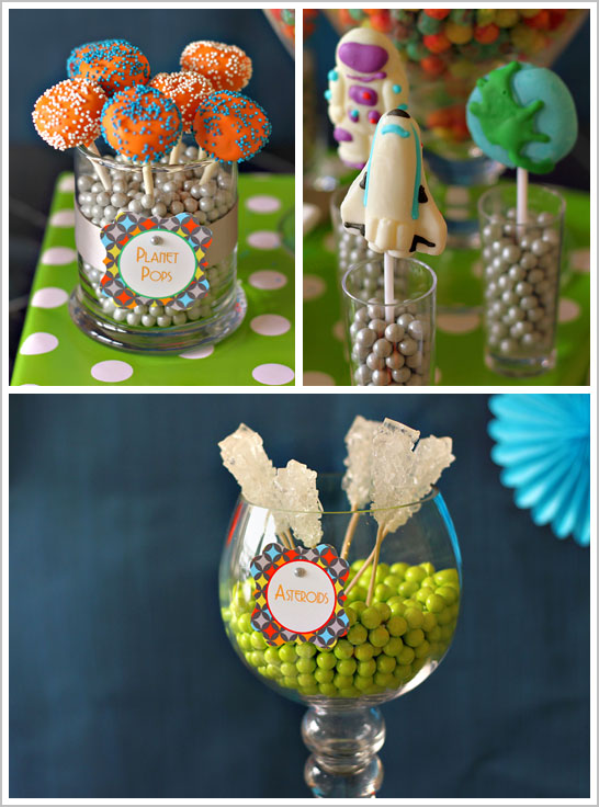 Oodles of Solar Snacks brought this theme to life! From Planet Pops (red velvet cake pops inspired by Bakerella) to stick candies shaped like a space shuttle, astronaut and planet Earth.