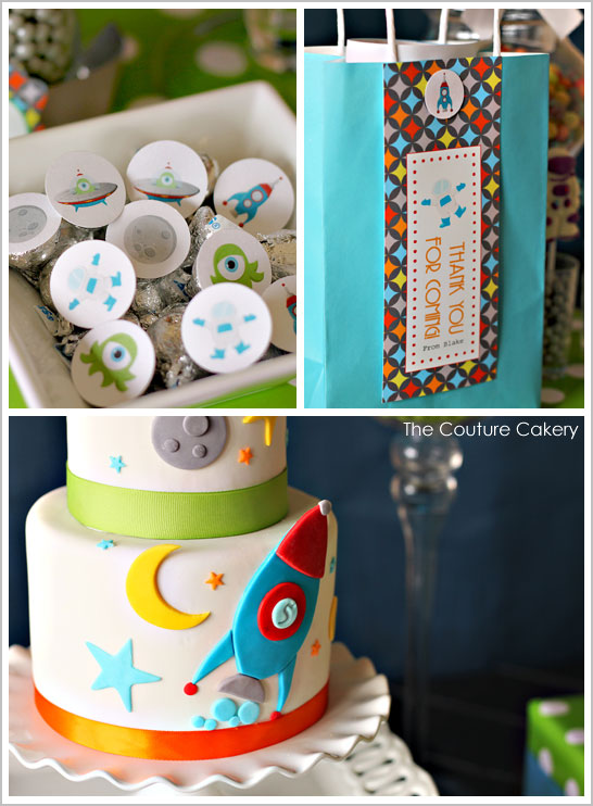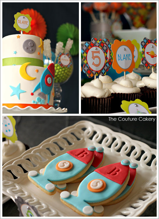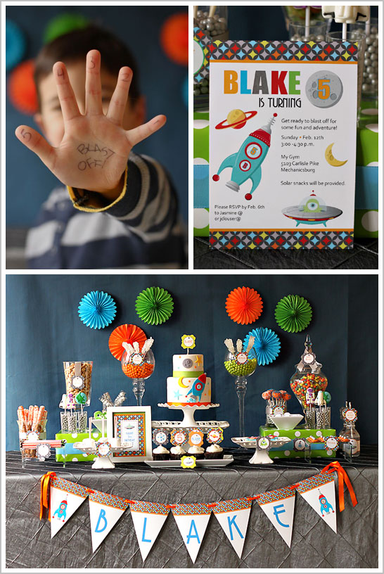 Today’s party is truly out of this world! We see so many adorable parties for little girls and babies… but great parties for little boys seem harder to come by. That makes today’s post even more fun! With a modern color scheme, oodles of creative details and a beautiful table of solar snacks, this party is perfect for little astronauts. Jasmine Clouser of The Couture Cakery let her imagination soar when she created this party for her son’s 5th birthday. Get ready to blast off for some fun and adventure with this incredible Outer Space Birthday Party!