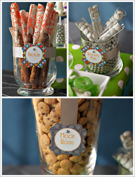 Trix cereal doubled as Space Rocks and provided an inexpensive treat to be served from a large apothecary jar. Meteoroids were created by topping round pretzels with orange candy melts and a silver sixlets. Too clever!