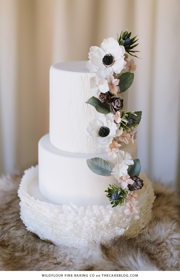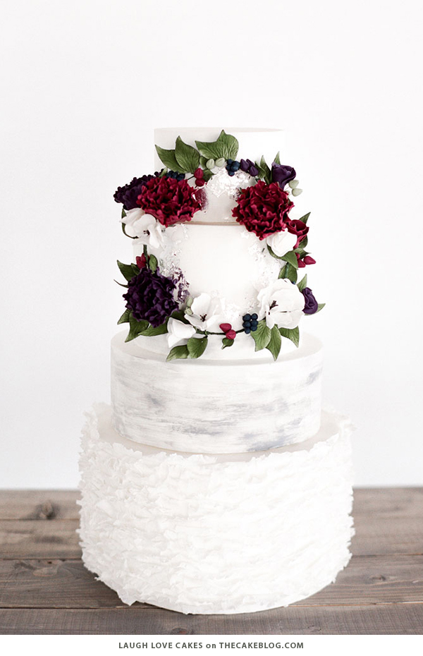 Slate grey watercolor meets whimsical ruffles in this design by Kayla Milligan of Laugh Love Cakes. A woodland-inspired wreath filled with rich blooms, foliage and navy berries completes the gorgeous look. (Photography by Brittany Mahood)
