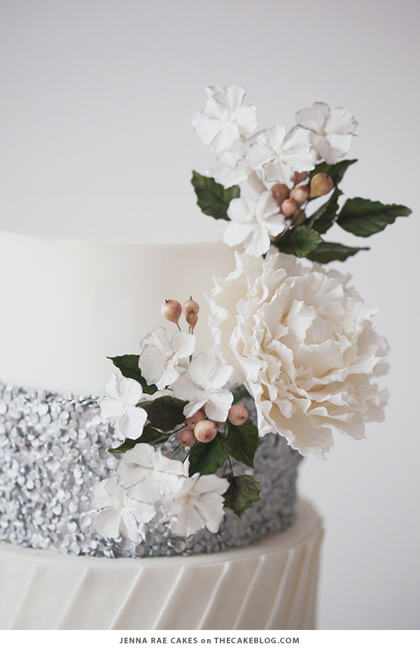 Pristine white fondant gets a dose of shimmer with silver sequins and white blooms in this gorgeous design by Jenna Rae Cakes. Click back to see more of this cake here and learn how to make it here. (Photography by Victoria Anne Photography)